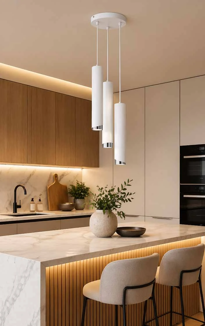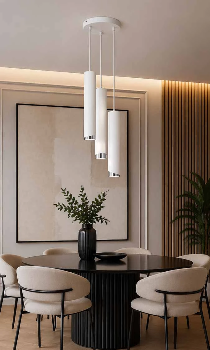 Zastosowanie trzech punktów świetlnych pozwala na równomierne i funkcjonalne oświetlenie wybranej strefy. Różne długości zawieszenia tub wprowadzają dynamikę i lekkość, dzięki czemu lampa doskonale prezentuje się nad stołem w jadalni, wyspą kuchenną czy w salonie. To idealne rozwiązanie zarówno do przestrzeni mieszkalnych, jak i komercyjnych.