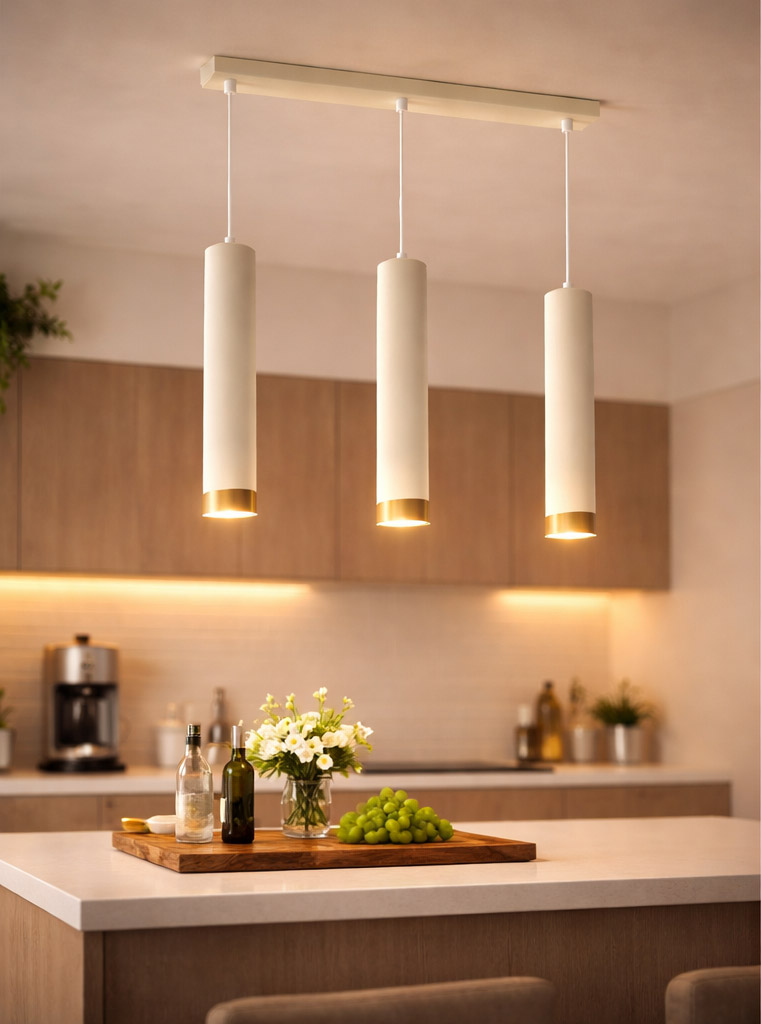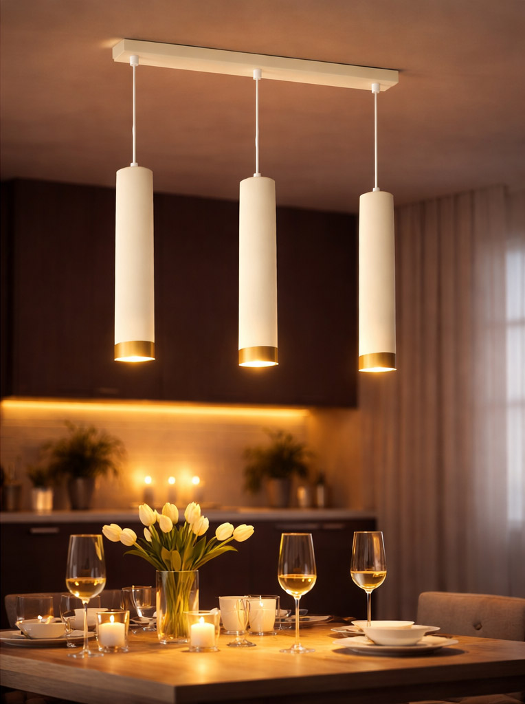 Beżowe, smukłe klosze zestawione ze złotym wykończeniem tworzą harmonijną i luksusową kompozycję, która doskonale podkreśla charakter przestrzeni.