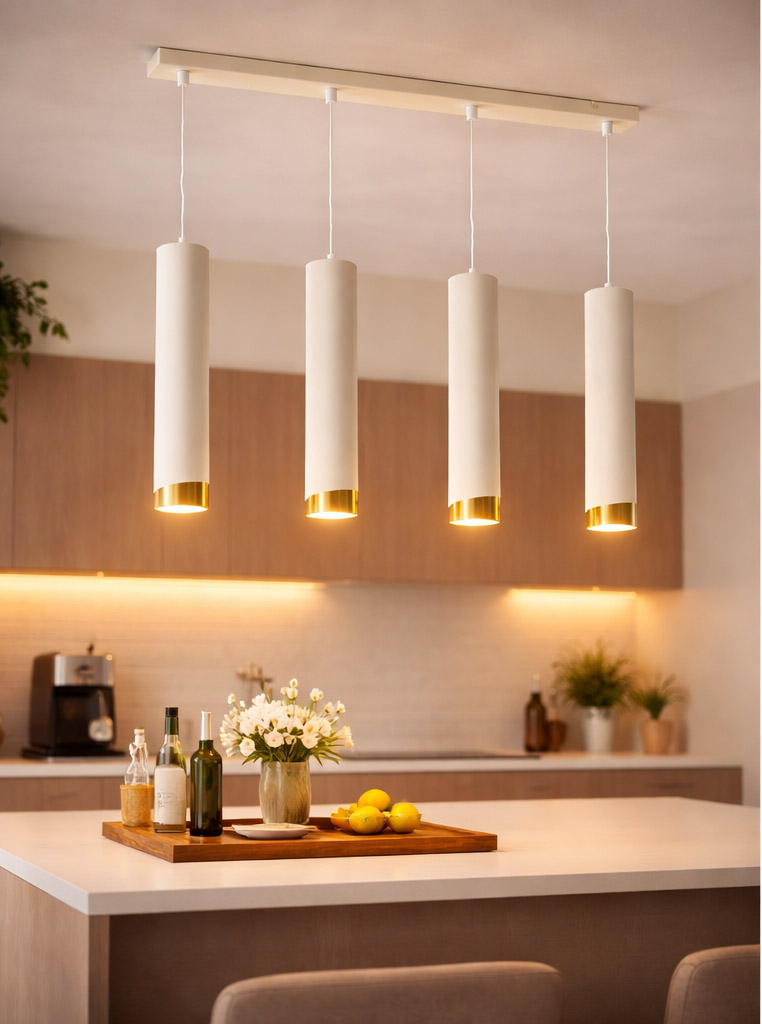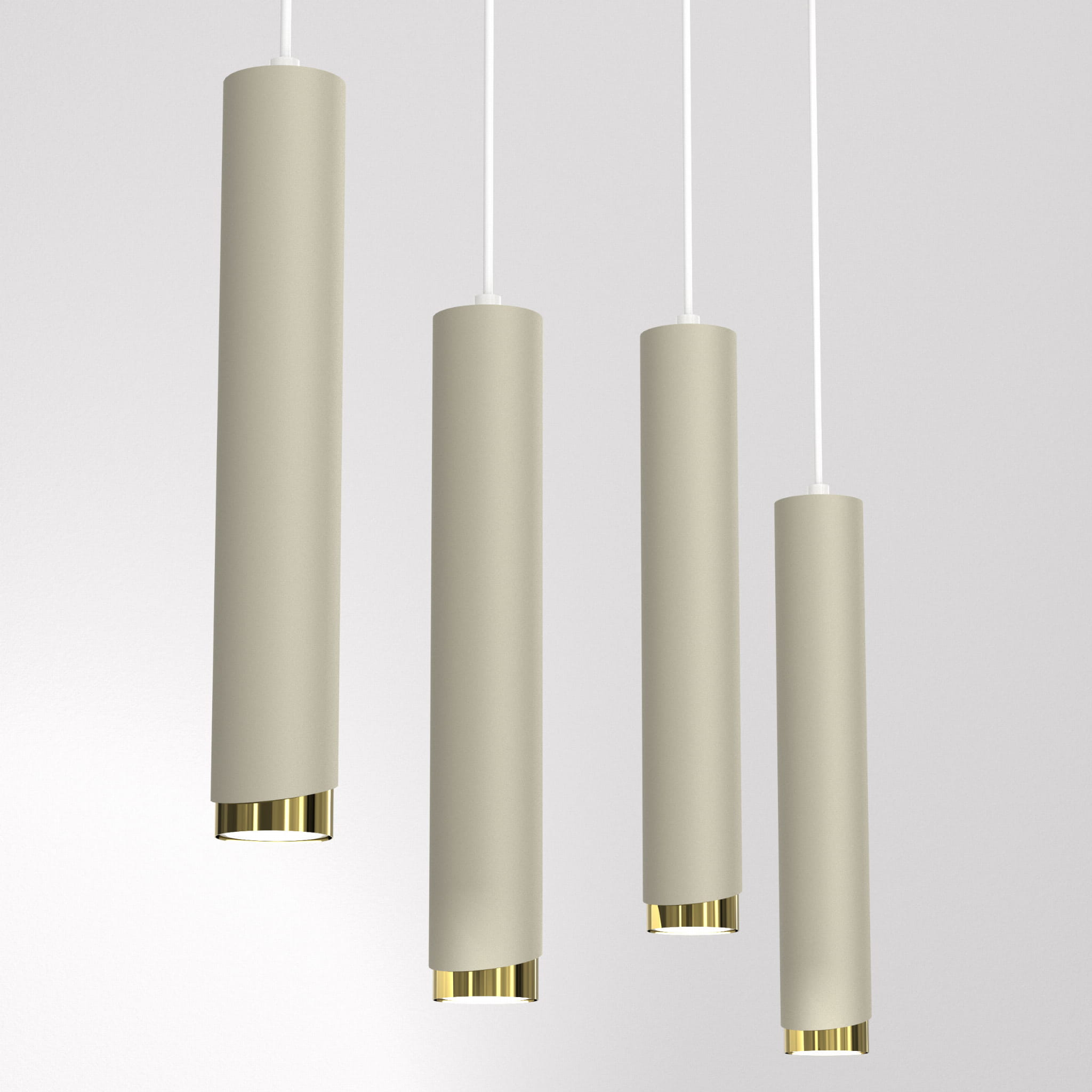 Smukłe, beżowe klosze zestawione z eleganckimi złotymi detalami tworzą spójną i luksusową kompozycję, która doskonale podkreśla charakter kuchni, jadalni czy salonu.