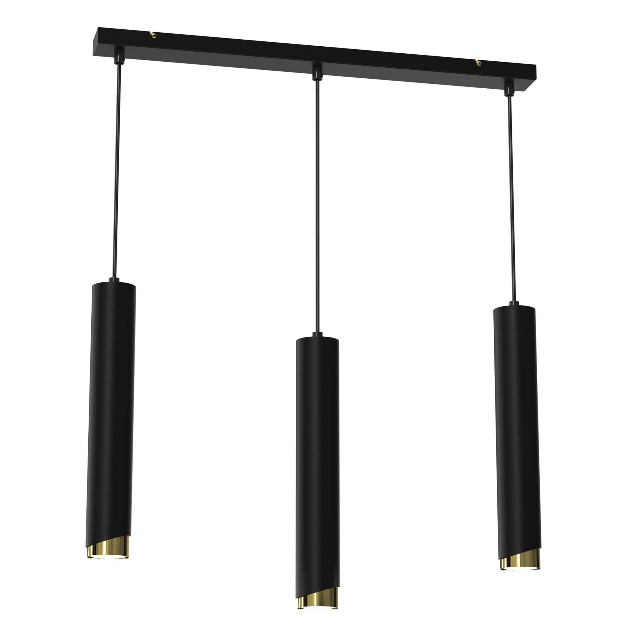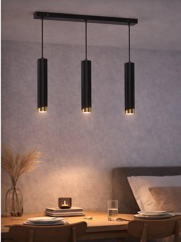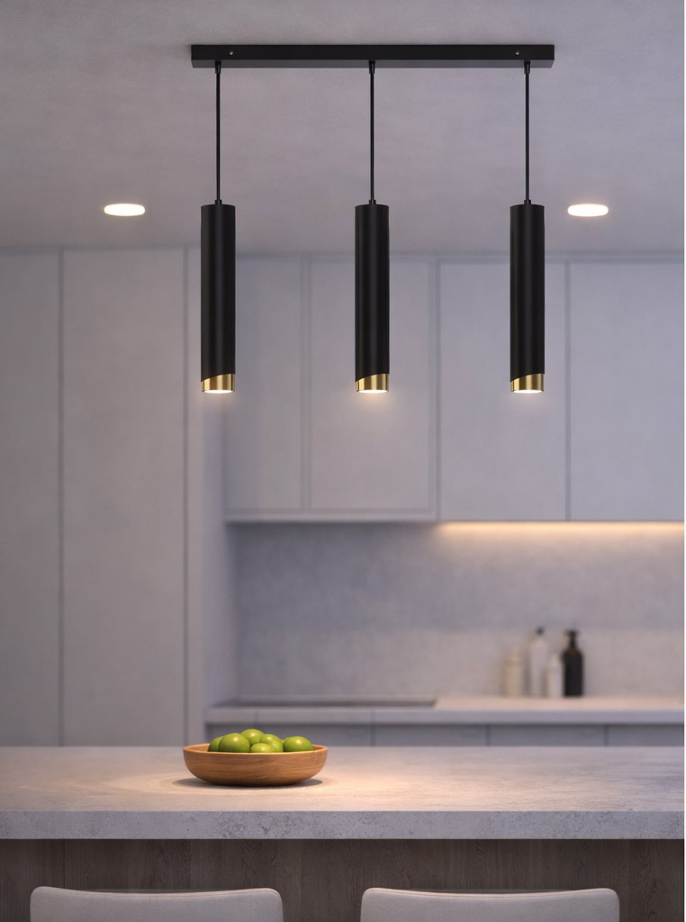 Aurora Luxe Gold Czarna potrójna na listwie to stylowa lampa wisząca, która doskonale podkreśla charakter nowoczesnych wnętrz i tworzy elegancką atmosferę w kuchni, jadalni lub salonie.