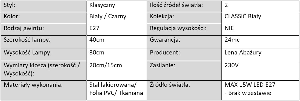 Dzięki metalowym stelażom w kolorze białym i czarnym, lampy Classic Biały z łatwością dopasujesz zarówno do jasnych, jak i ciemniejszych wnętrz. Ich klasyczny kształt abażurów sprawia, że nie wychodzą z mody, a jednocześnie zapewniają doskonałą funkcjonalność.