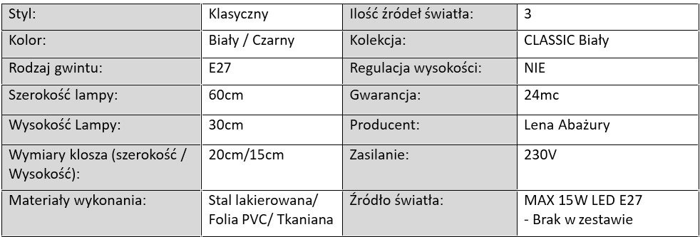Każda lampa wyposażona jest w standardowy gwint E27, co zapewnia kompatybilność z popularnymi żarówkami LED. Modele występują w wariantach jedno-, dwu- oraz trzypunktowych, co umożliwia dostosowanie natężenia światła do funkcji i metrażu pomieszczenia. Lampy mają biały abażur z elegancką folią wewnętrzną, która równomiernie rozprasza światło i tworzy przytulną atmosferę.