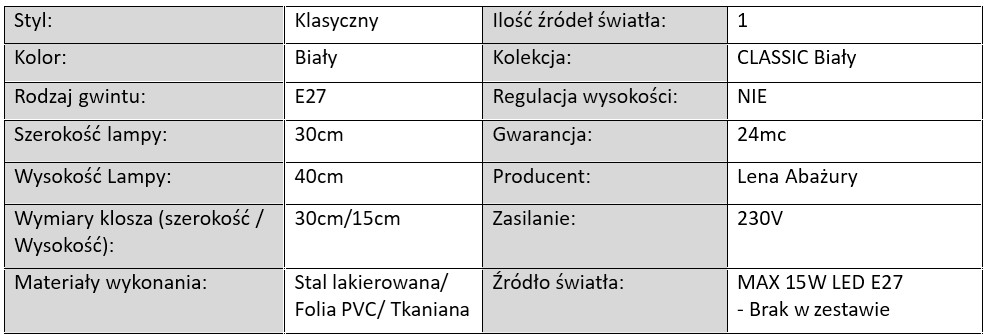 Dzięki metalowym stelażom w kolorze białym i czarnym, lampy Classic Biały z łatwością dopasujesz zarówno do jasnych, jak i ciemniejszych wnętrz. Ich klasyczny kształt abażurów sprawia, że nie wychodzą z mody, a jednocześnie zapewniają doskonałą funkcjonalność.