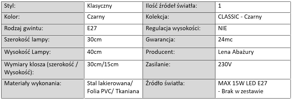Lampy z serii CLASSIC – Czarny to nie tylko styl, ale także trwałość i funkcjonalność. Każdy model został zaprojektowany z dbałością o detal, co widać zarówno w wykończeniu abażurów, jak i w konstrukcji metalowych stelaży. Stelaże dostępne są w kolorze czarnym lub białym, wykonane z metalu malowanego proszkowo, dzięki czemu są odporne na zarysowania, uszkodzenia i działanie wilgoci.