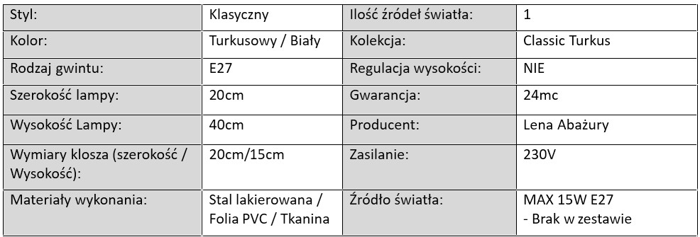 Każda lampa w tej serii wyróżnia się abażurem w pięknym turkusowym kolorze, od wewnątrz wykończonym białą folią PVC, co zapewnia równomierne i przyjemne dla oka rozproszenie światła. Stabilne i estetyczne stelaże dostępne są w wariantach kolorystycznych, które łatwo dopasujesz do swojego wnętrza. Wszystkie modele przystosowane są do żarówek z popularnym gwintem E27, dzięki czemu możesz swobodnie dobrać moc i barwę światła do swoich potrzeb.