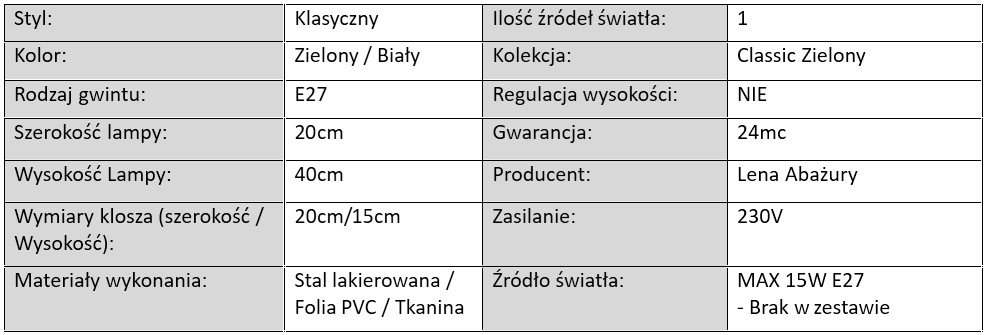Lampy z serii Classic Butelkowa Zieleń wykonano z wysokiej jakości materiałów. Abażury pokryte są tkaniną w modnym odcieniu butelkowej zieleni, pod którą znajduje się biała folia PVC – zapewnia to równomierne, przyjemne dla oka rozproszenie światła. Całość uzupełniają metalowe stelaże w dwóch wersjach kolorystycznych: klasycznej bieli lub głębokiej czerni, co umożliwia idealne dopasowanie lamp do stylu wnętrza.