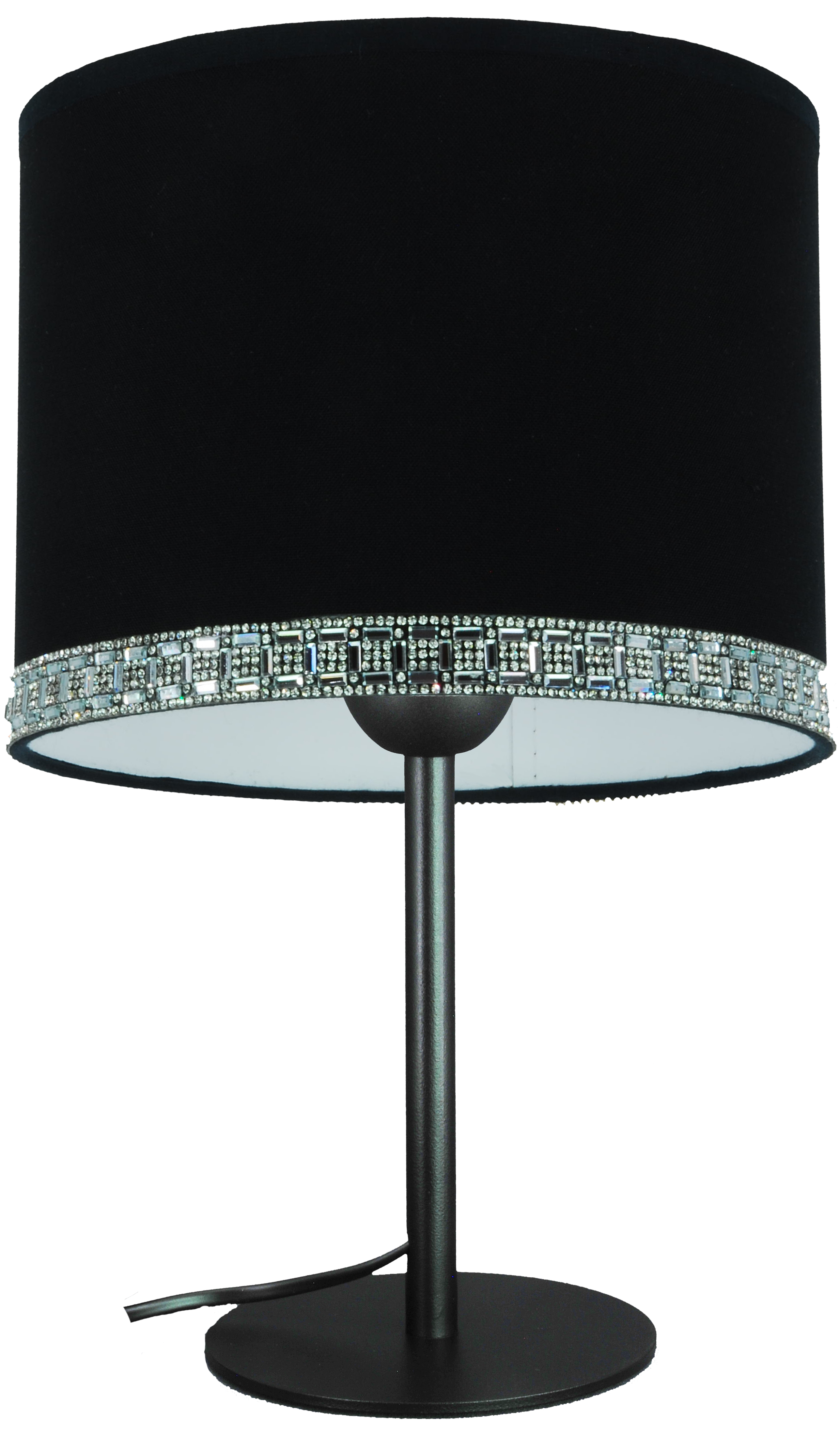 Ekskluzywny design – czarny abażur, biała folia, pas z kryształków
