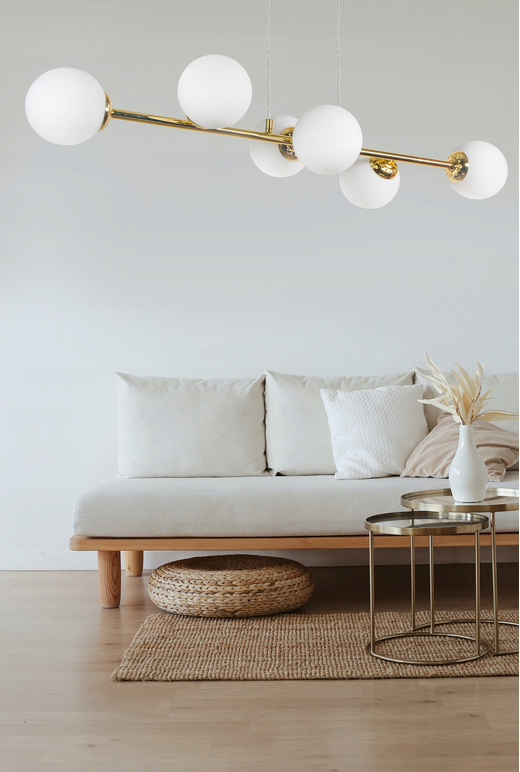 Każdy element Stellar Gold to starannie zaprojektowany detal – matowe klosze w kształcie kul przypominają świetliste orbity, a połyskliwe złote akcenty dodają całości wyjątkowej elegancji. Idealnie sprawdzi się w salonie, sypialni czy jadalni, stając się nie tylko źródłem światła, ale także centralnym punktem aranżacji.