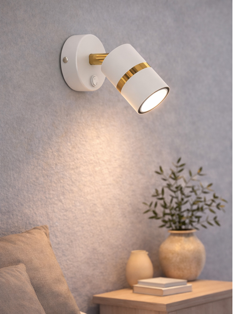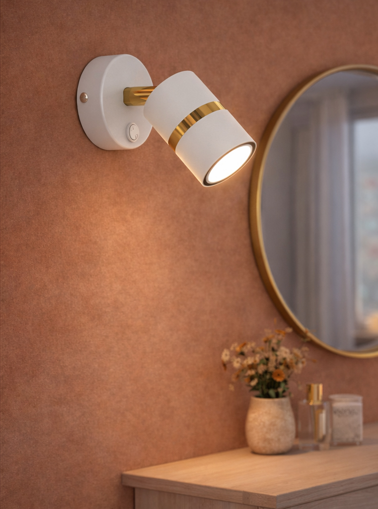Aurora Gold Biała z włącznikiem to elegancki, nowoczesny kinkiet ścienny zaprojektowany z myślą o funkcjonalności i ponadczasowym designie. Połączenie matowej bieli ze złotym detalem nadaje lampie subtelnej elegancji, dzięki czemu doskonale wpisuje się w aranżacje nowoczesne, modern classic, glamour oraz japandi.