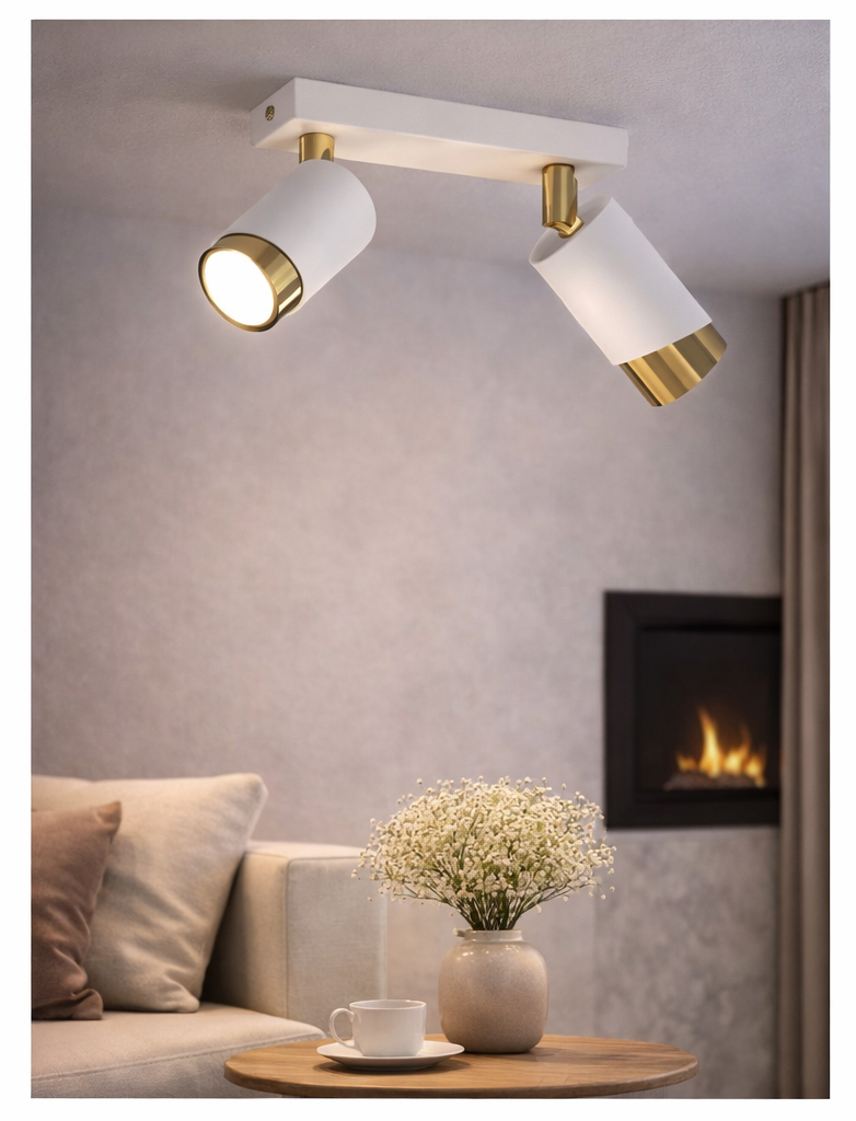 Aurora Luxe Gold Biała 2 to elegancka lampa sufitowa typu spot, która łączy minimalistyczny design z luksusowym złotym wykończeniem. Biała, matowa obudowa w połączeniu ze złotym wnętrzem kloszy tworzy stylowy i nowoczesny efekt, idealnie pasujący do wnętrz nowoczesnych, modern classic, japandi oraz glamour.