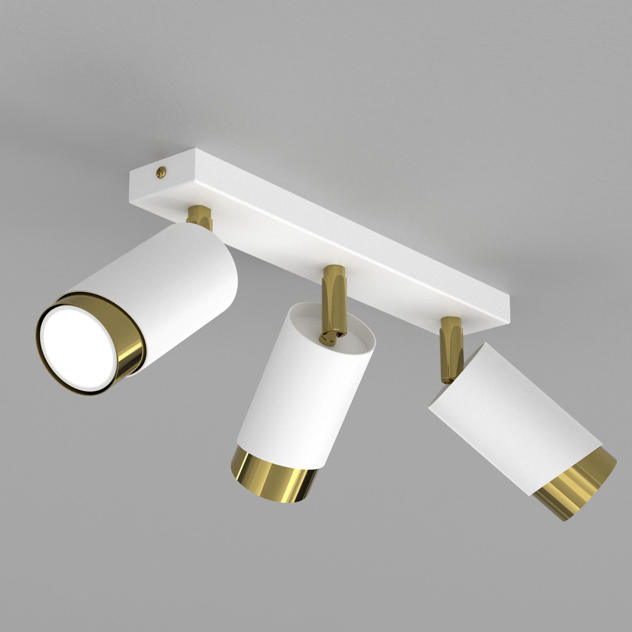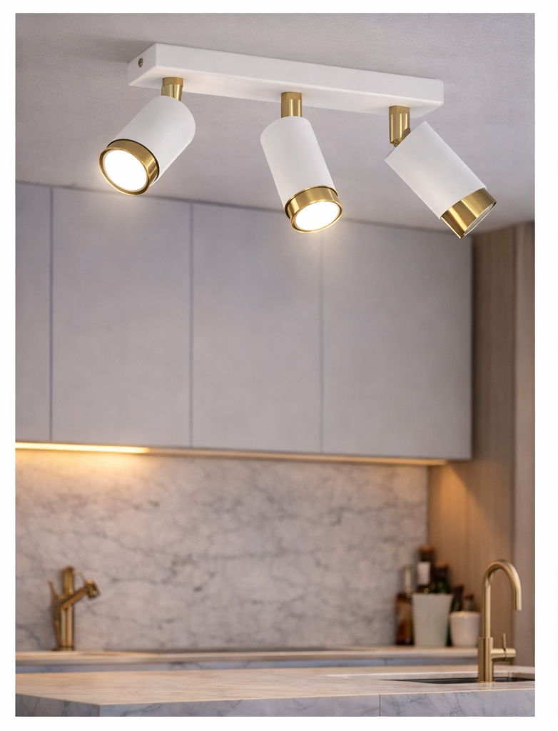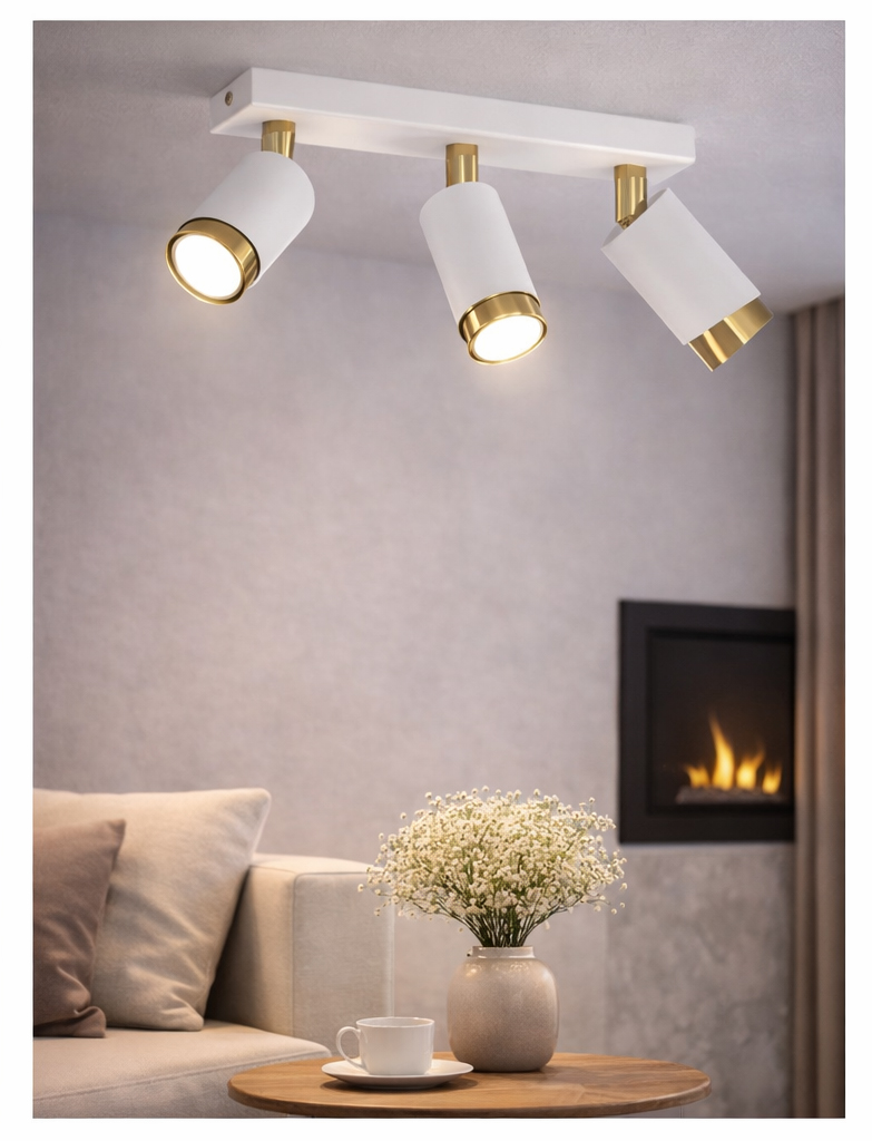Aurora Luxe Gold Biała 3 to nowoczesna lampa sufitowa typu spot z trzema regulowanymi reflektorami, która łączy minimalistyczną formę z eleganckim złotym wykończeniem. Matowa biel w połączeniu ze złotym wnętrzem kloszy tworzy stylowy i ponadczasowy efekt, idealny do wnętrz nowoczesnych, modern classic, glamour oraz japandi.
