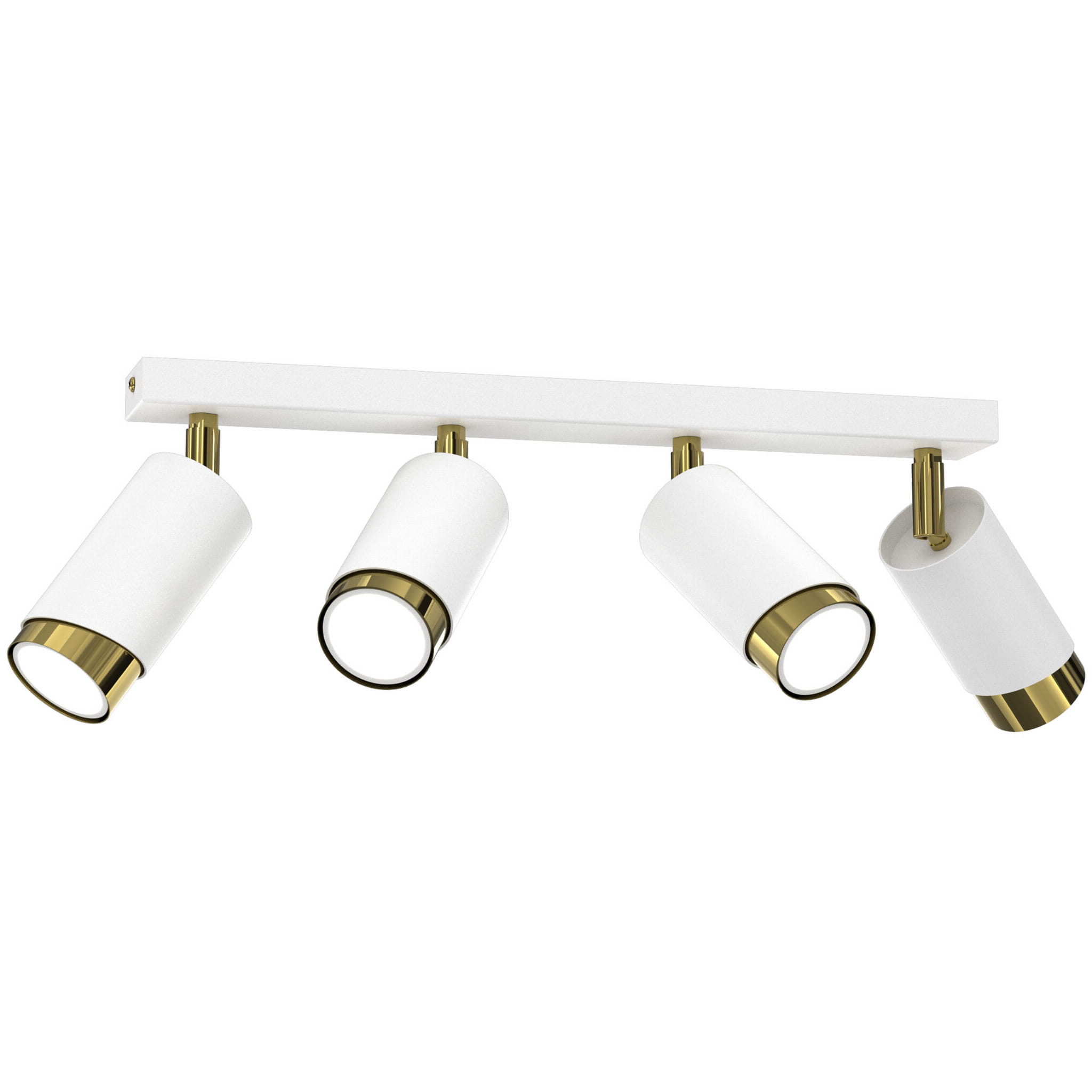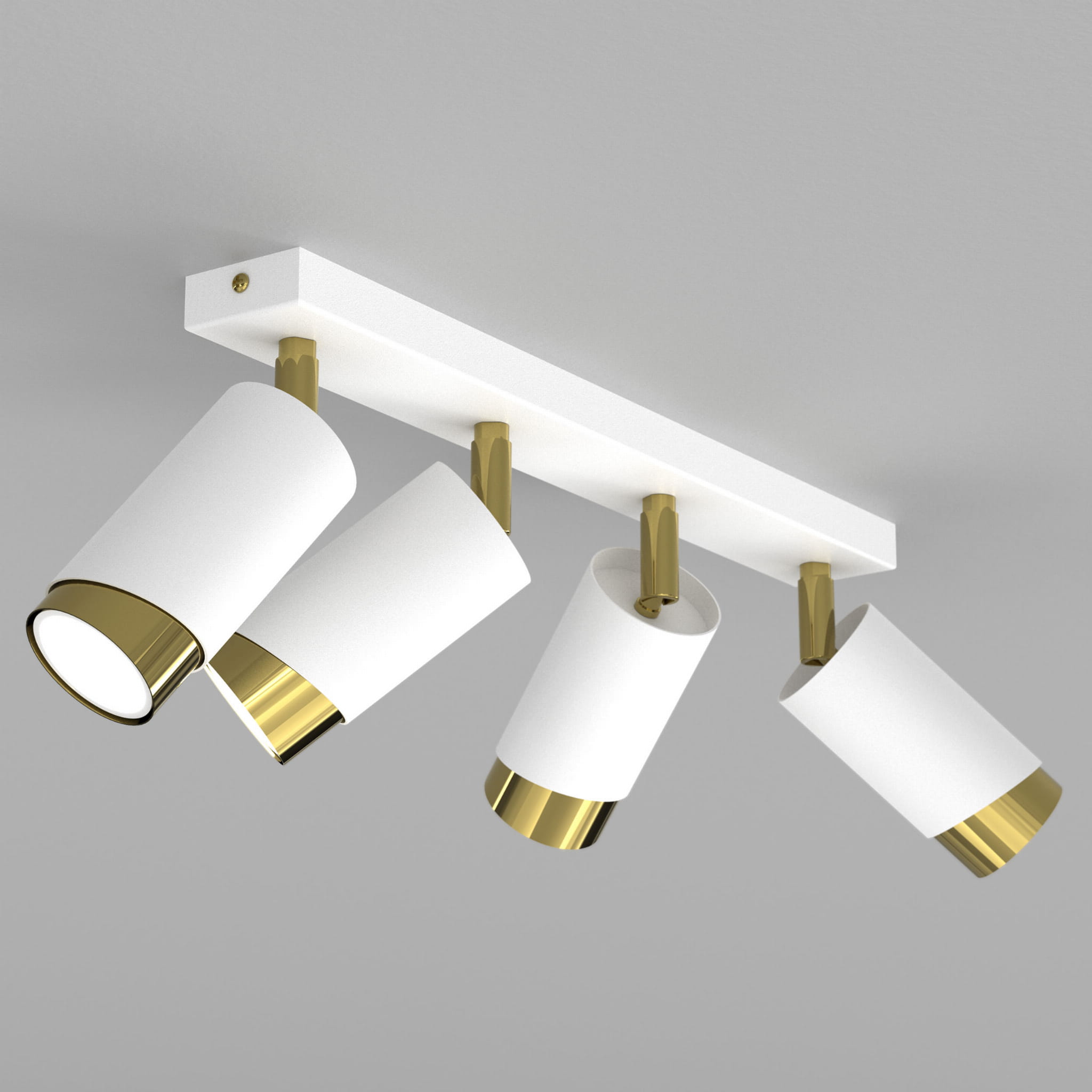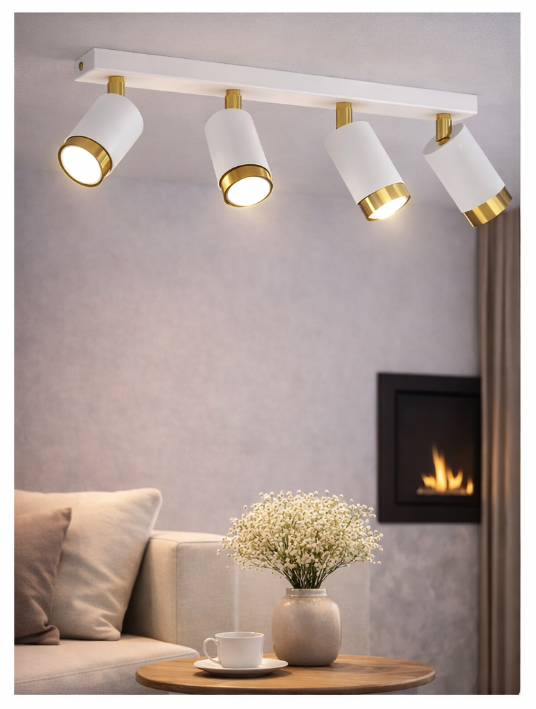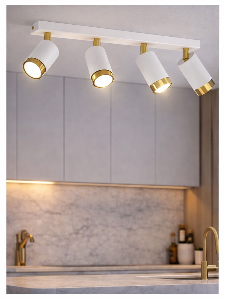 Aurora Luxe Gold Biała 4 to nowoczesna lampa sufitowa typu spot z czterema regulowanymi reflektorami, która łączy minimalistyczną formę z eleganckim złotym wykończeniem. Matowa biel w zestawieniu ze złotym wnętrzem kloszy tworzy stylową i ponadczasową kompozycję, idealną do wnętrz nowoczesnych, modern classic, glamour oraz japandi.