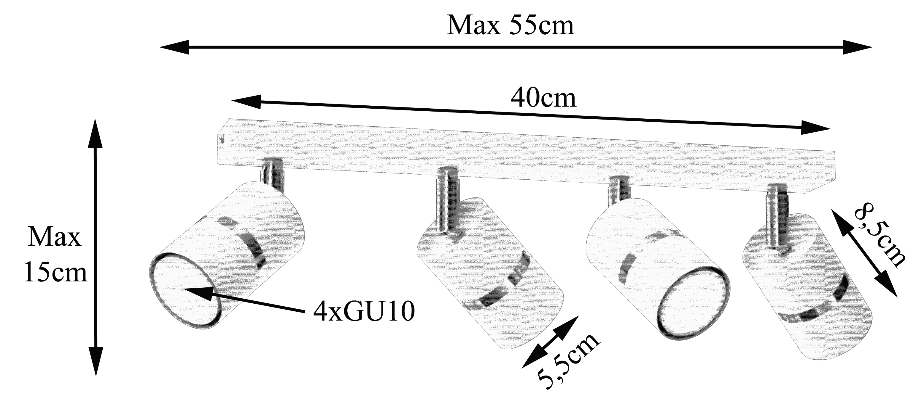 Cztery punkty światła umieszczone na prostej, geometrycznej listwie zapewniają równomierne oświetlenie pomieszczenia oraz stanowią elegancki element dekoracyjny.