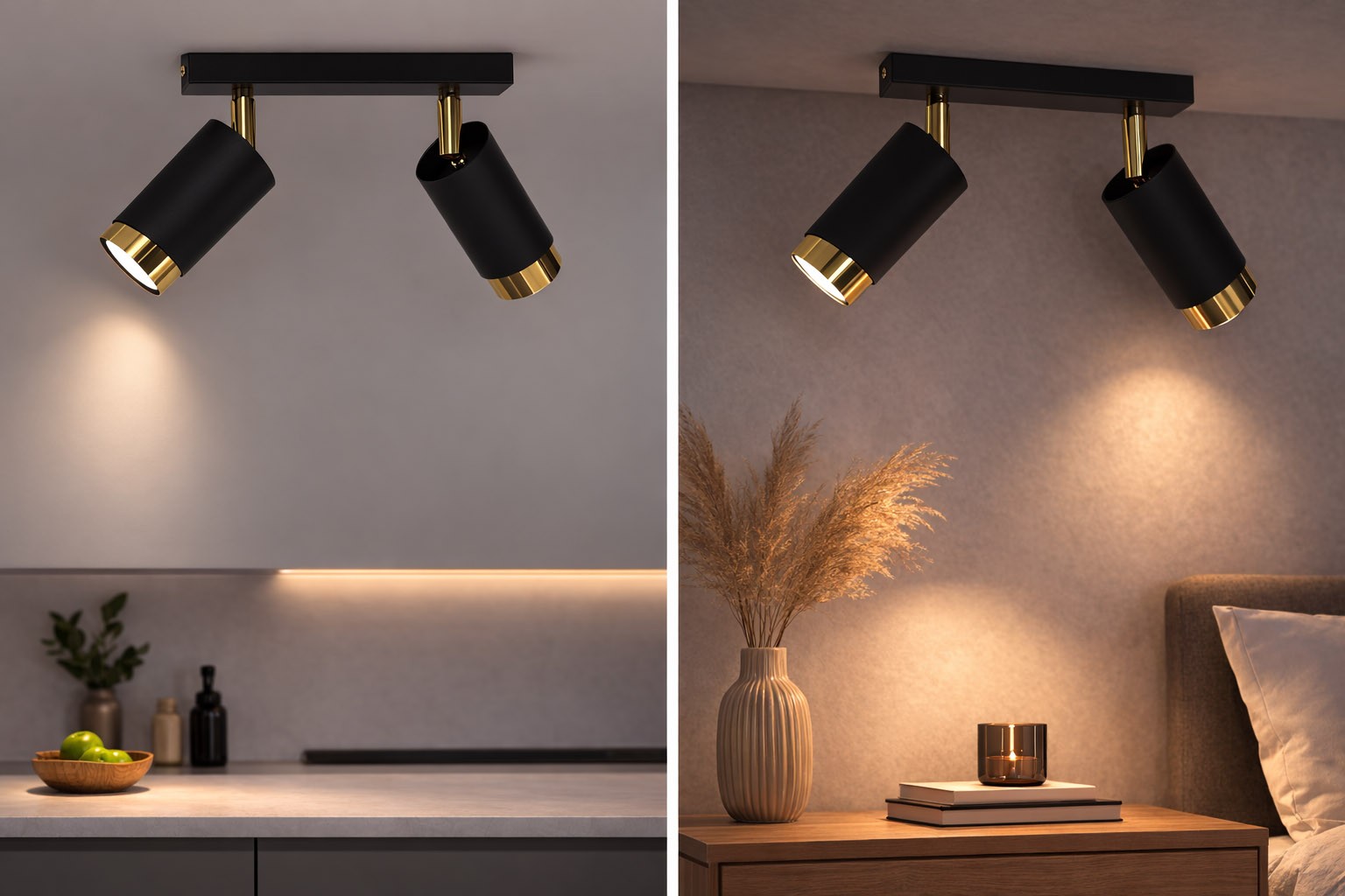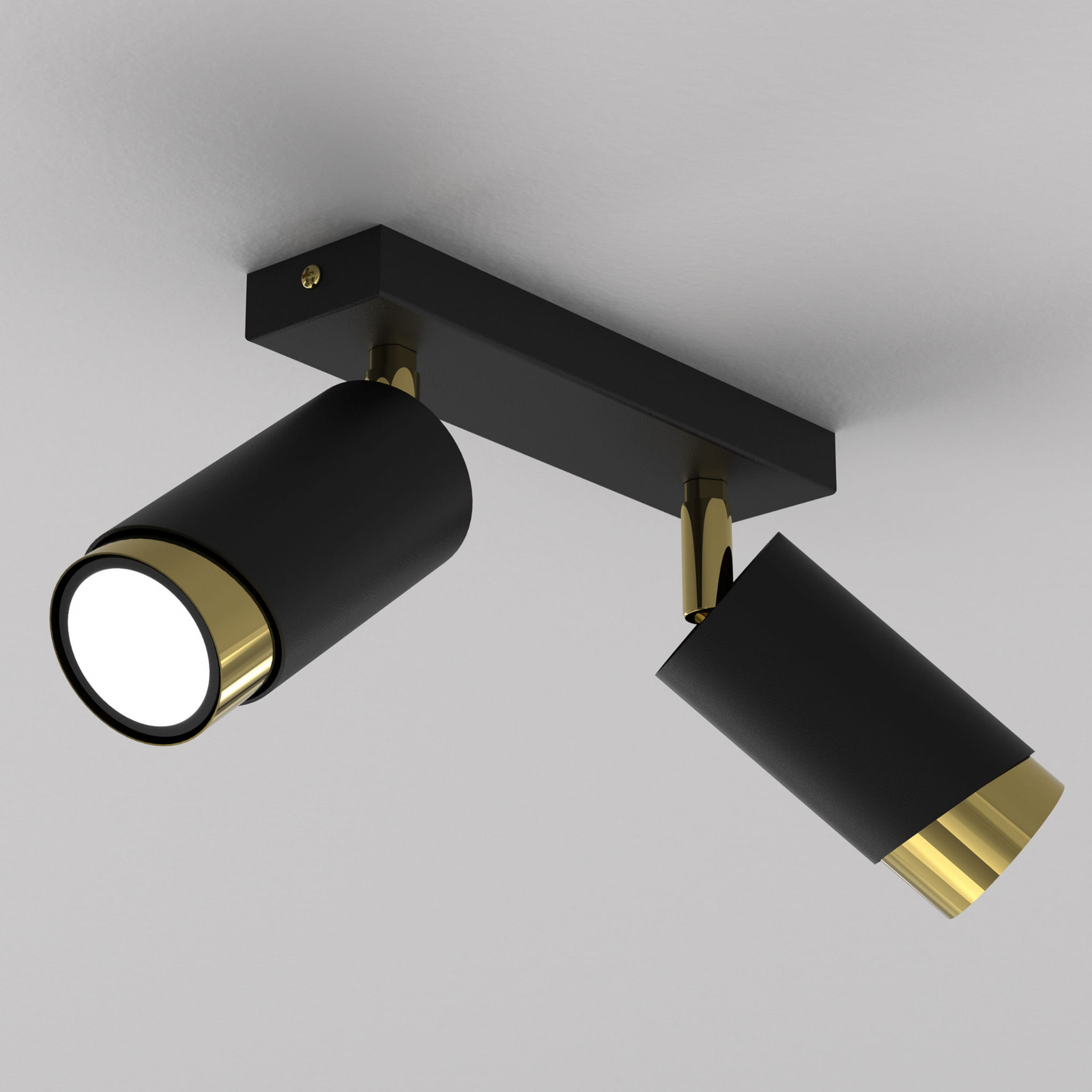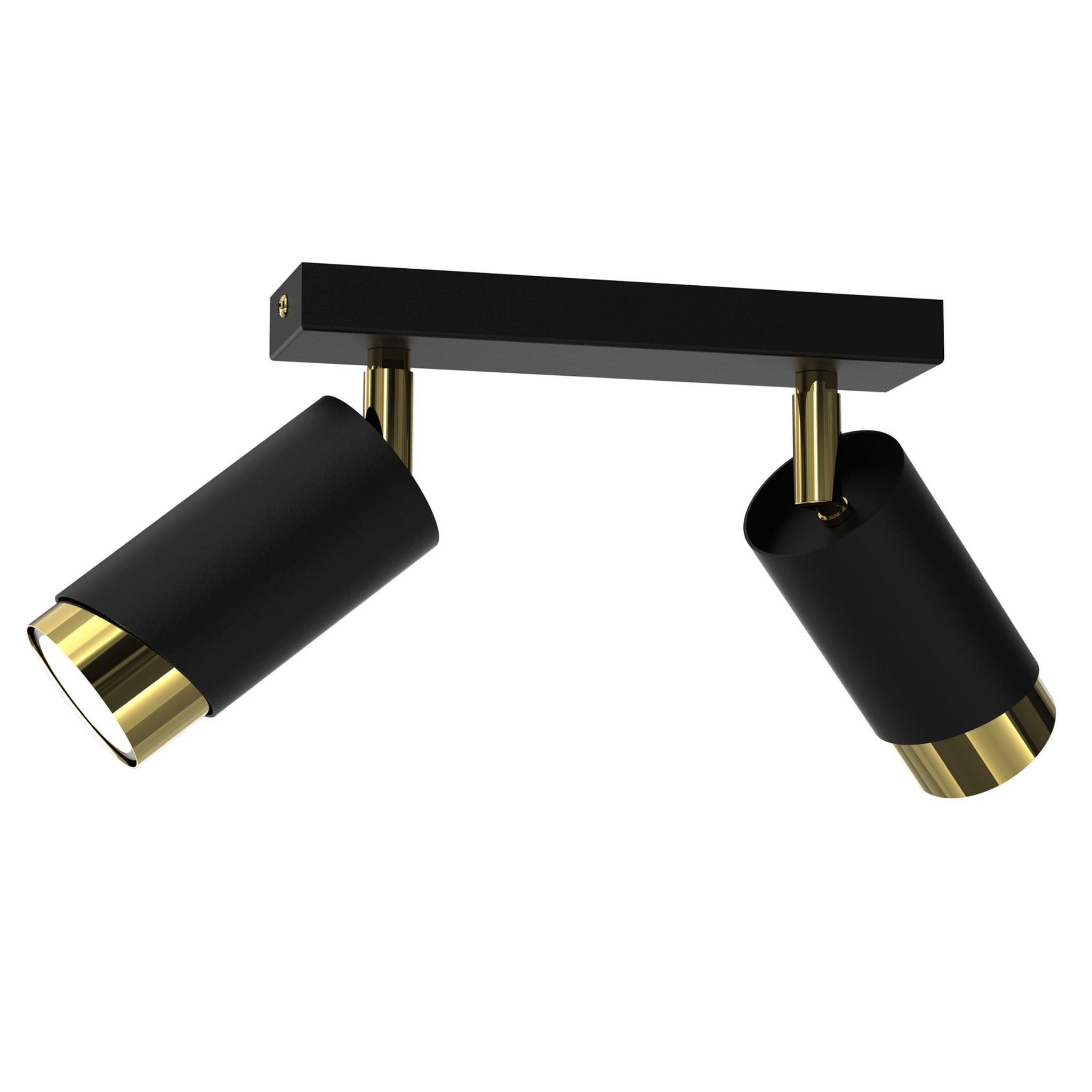 Lampa sufitowa Aurora Luxe Gold Czarna podwójna to nowoczesna oprawa oświetleniowa typu spot, która łączy minimalistyczny design z eleganckim, luksusowym wykończeniem. Dwa cylindryczne reflektory w matowej czerni zostały zamontowane na stylowej listwie sufitowej i wykończone efektownym złotym wnętrzem, które nadaje lampie wyjątkowego charakteru.