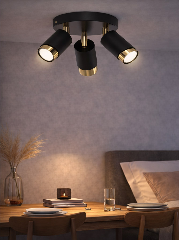 Każdy z trzech reflektorów jest regulowany, dzięki czemu można skierować światło w wybrane miejsce pomieszczenia. Lampa świetnie sprawdzi się jako: