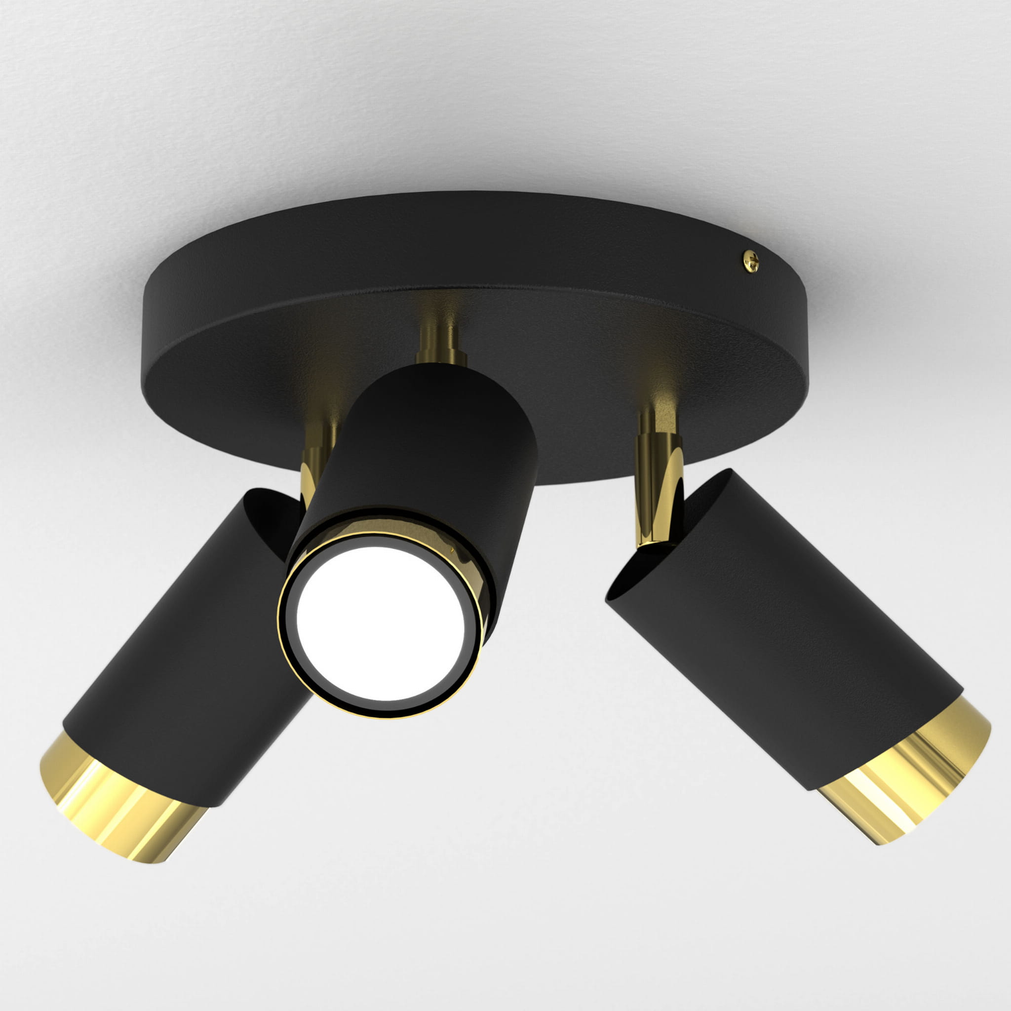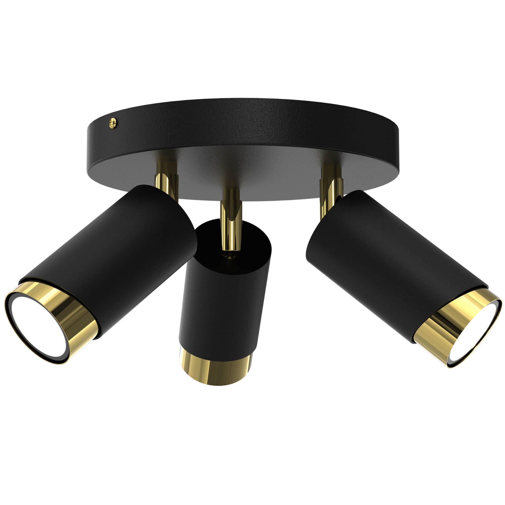 Lampa sufitowa Aurora Luxe Gold Czarna potrójna to elegancka i nowoczesna oprawa oświetleniowa, która łączy minimalistyczny design z luksusowym wykończeniem. Trzy cylindryczne reflektory w matowej czerni zostały zamontowane na okrągłej podsufitce, a ich wnętrze wykończono efektownym złotym akcentem, który nadaje lampie wyjątkowego charakteru.