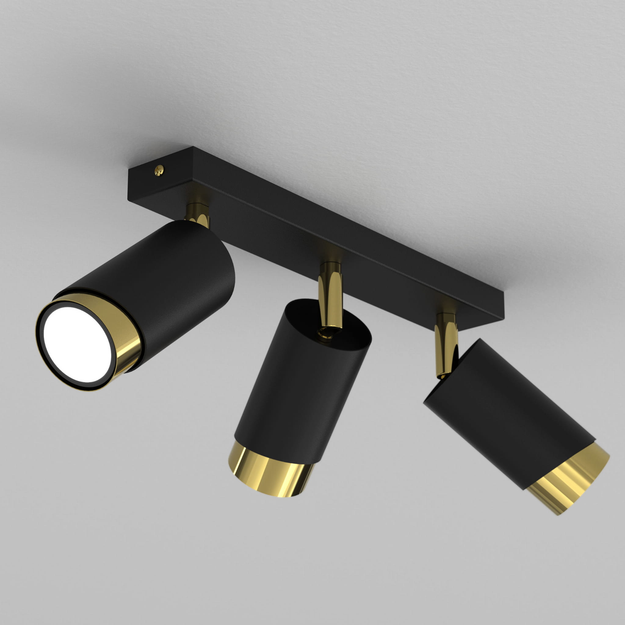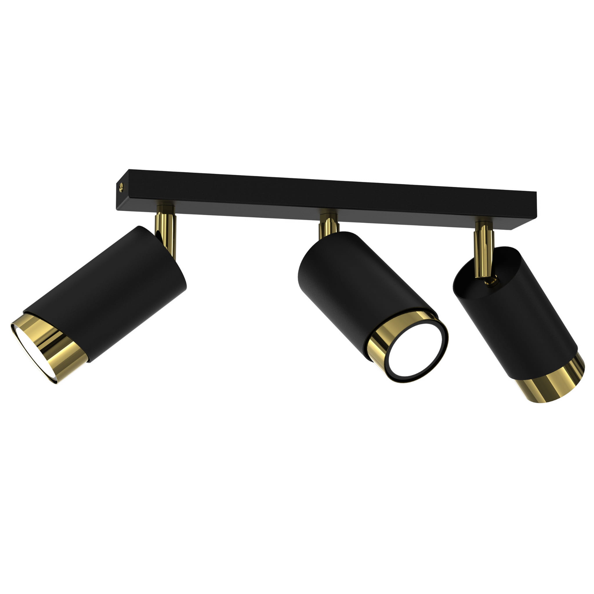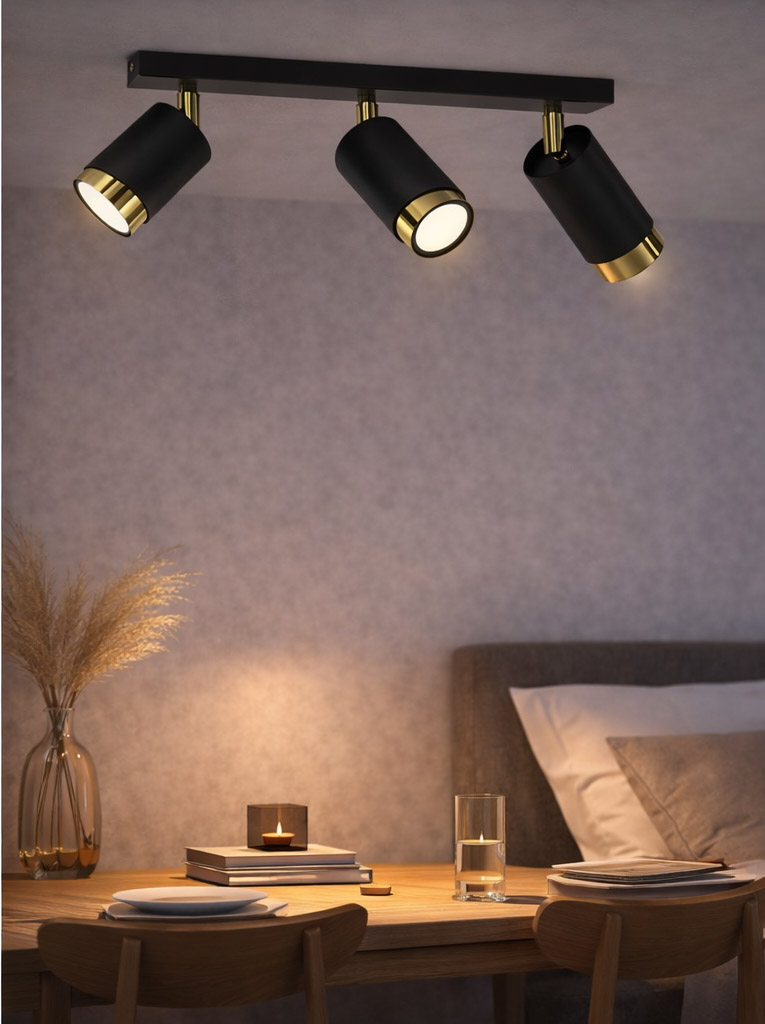 Lampa sufitowa Aurora Luxe Gold Czarna potrójna to nowoczesna oprawa oświetleniowa typu spot, która łączy minimalistyczny design z eleganckim wykończeniem. Trzy cylindryczne reflektory w matowej czerni zostały zamontowane na stylowej listwie sufitowej, a ich wnętrze wykończono efektownym złotym akcentem, który nadaje lampie luksusowego charakteru.