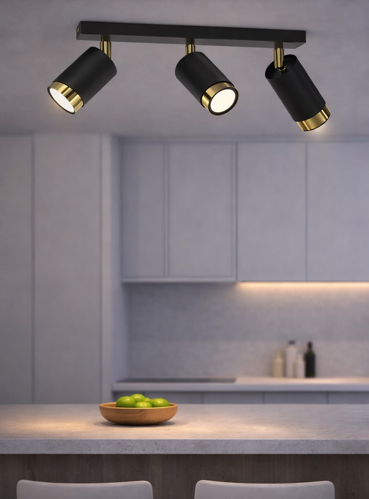 Dzięki połączeniu czerni i złota lampa doskonale wpisuje się w aranżacje nowoczesne, loftowe, glamour oraz modern classic. To idealne rozwiązanie dla osób, które szukają stylowego i funkcjonalnego oświetlenia punktowego do salonu, kuchni, korytarza lub sypialni.