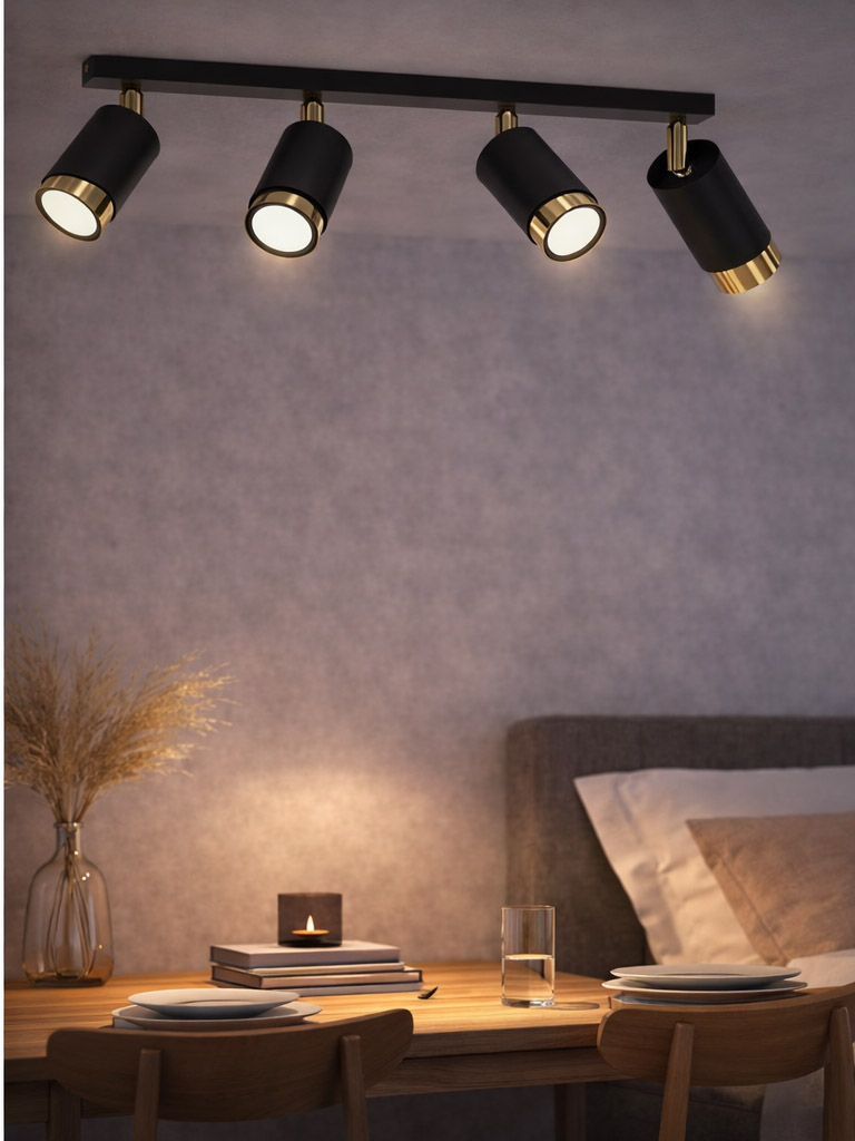Lampa sufitowa Aurora Luxe Gold Czarna czteropunktowa to nowoczesna oprawa oświetleniowa typu spot, która łączy minimalistyczny design z eleganckim, luksusowym wykończeniem. Cztery cylindryczne reflektory w matowej czerni zostały zamontowane na stylowej listwie sufitowej, a ich wnętrze wykończono efektownym złotym akcentem, który nadaje lampie wyjątkowego charakteru.